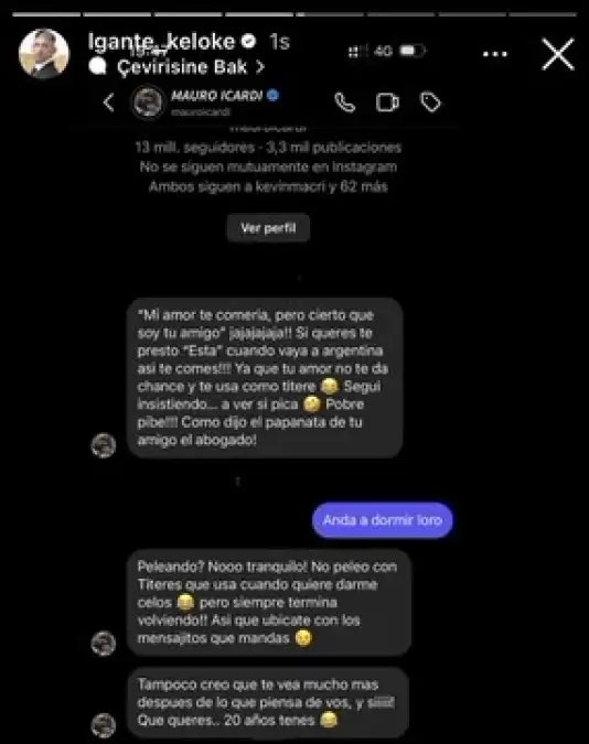 Icardi: "Wanda'nın beni kıskandırmak için kullandığı kuklalarla kavga etmem ben. Ayrıca kendini ele veriyorsun. Seni papağan gibi gezdirip duran kendisi. Ona saygı duymaya devam et ama dikkat et her zaman geri dönüyor. Yoksa geçen hafta birlikte olduğumuzu söyleyen bir not yayınlandığını görmedin mi? Wanda Nara beni geri kazanmaya çalışıyordu. Ben ona hayır dedim. Aşağılanmış bir kadının oyununa düştün. Beni kıskandırdığı tek kişi sen değilsin. O her zaman beni bulmak için geri dönüyor."